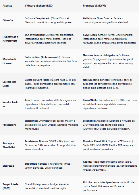 Per concludere, VMware resta una piattaforma solida e completa, ma Proxmox rappresenta un’alternativa matura, flessibile e sostenibile. A fare la differenza sarà la capacità delle PMI di scegliere la soluzione che meglio bilancia costi, competenze interne e autonomia tecnologica.