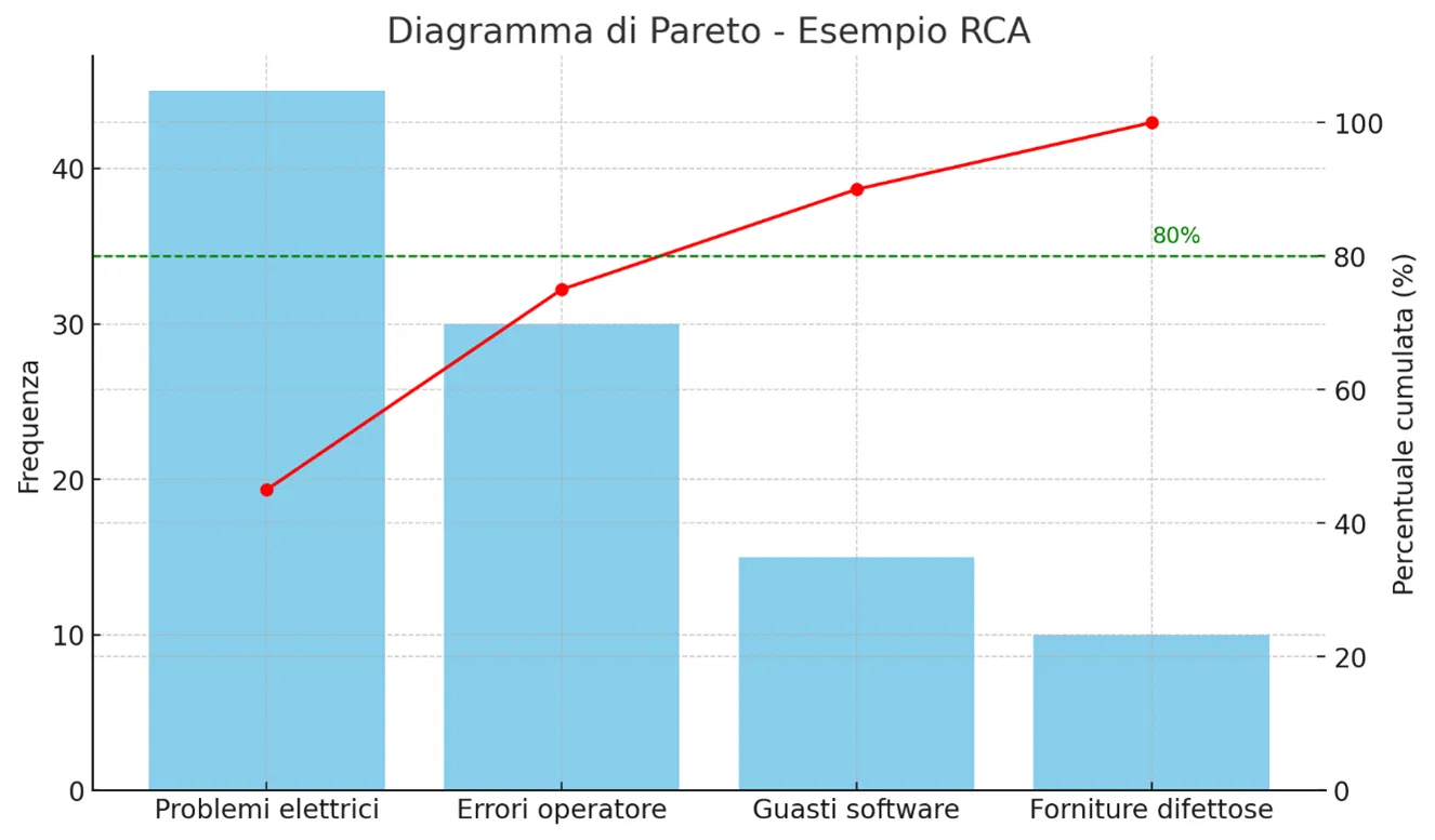 2. Diagramma di Pareto: questa metodologia sfrutta i concetti matematici di Vifred Pareto, in particolare la regola 80/20 in concomitanza con una curva cumulativa. Ma in che senso? Il grafico mostra quali sono le principali cause che contribuiscono ad innescare un problema e, in particolare, viene mostrato come il 20% delle cause possa generare l’80% degli effetti. Questo ci permette di individuare pochi ma principali inneschi e, di conseguenza, rende più pratico individuare le priorità. Inoltre, la componente grafica aiuta a visualizzare l’importanza e la quantità degli effetti generati da poche cause.