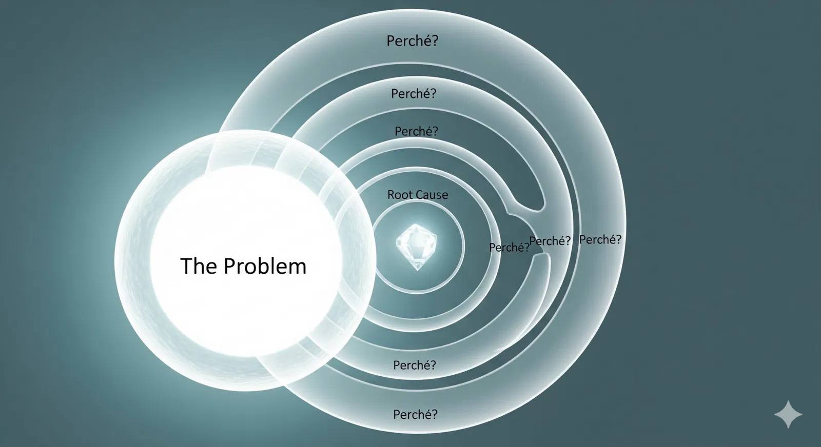 Lo scopo è incentivare il RCA Team a non fermarsi al primo “perché”, ma ad andare oltre la prima causa principale. In alcuni casi basterà domandarsi solamente tre/quattro volte “Perché?”, mentre altre volte bisognerà spingere la ricerca delle cause il più lontano possibile per riuscire a identificare l’origine del problema.